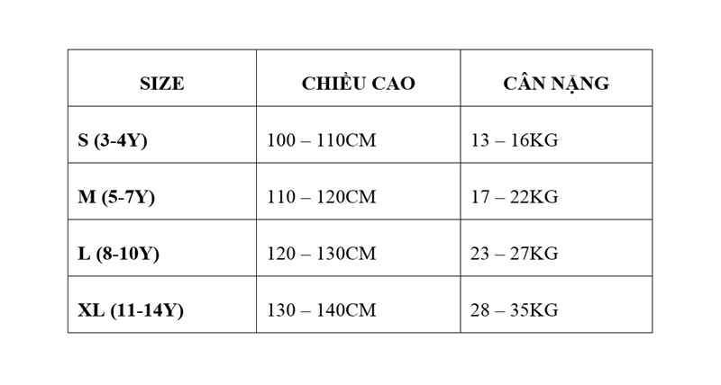 SIZE XL (11-14): CAO DƯỚI 145CM, CÂN NẶNG TỪ 28 - 35KG.